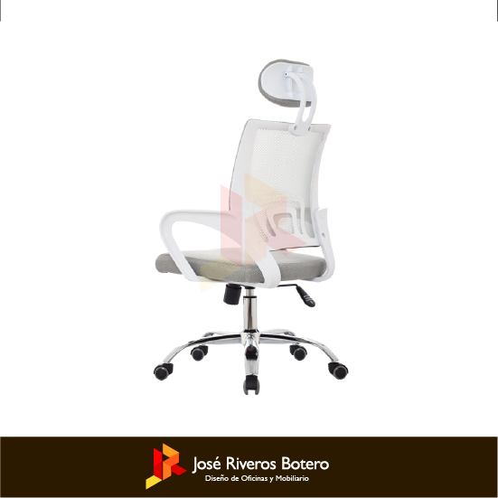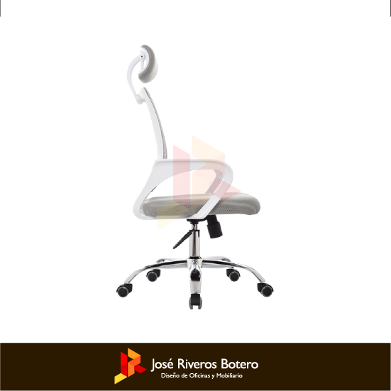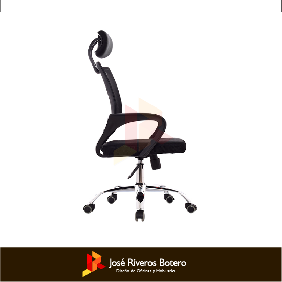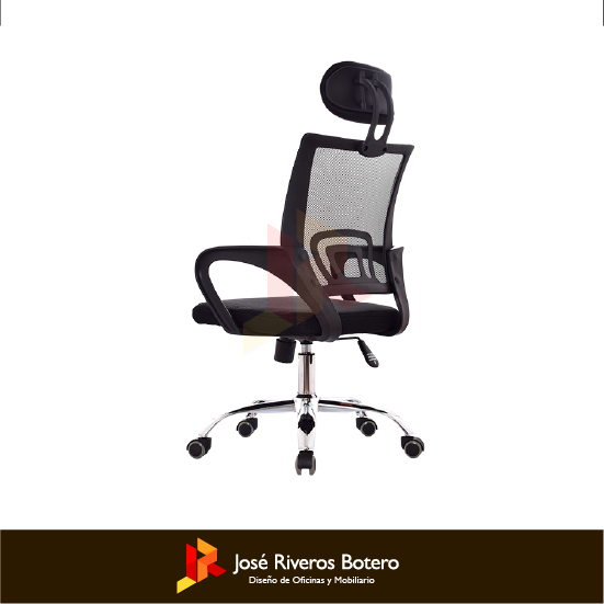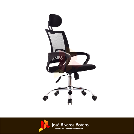 Mecanismo basculante con una posición de bloqueo a 90°, ruedas goma 50 mm, espaldar en malla poliéster, araña 60 cm, brazo fijo, asiento tapizado en tela tipo malla, espuma laminada y cabecero tapizado.