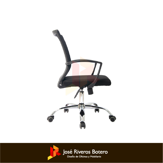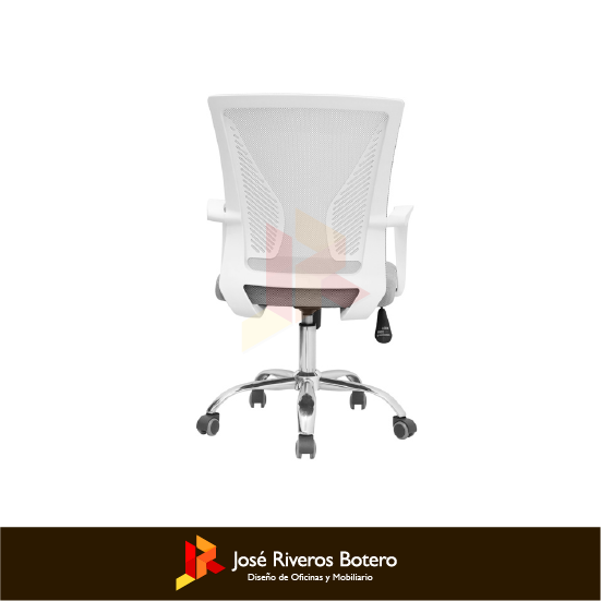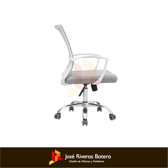 Marco inyectado en polipropileno, tapizado en malla, soporte lumbar fijo, brazos fijos en polipropileno, asiento en espuma laminada, mecanismo basculante, ruedas goma.