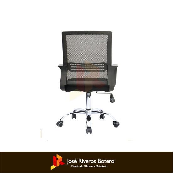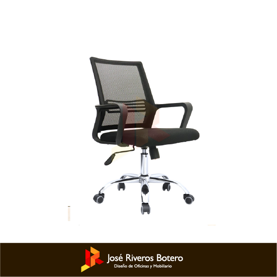 Espaldar marco inyectado en polipropileno, tapizado en malla, asiento en espuma laminada, brazos fijos en polipropileno, mecanismo basculante, ruedas en goma, base cromada 5 puntas.