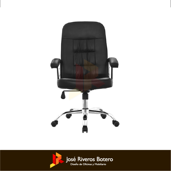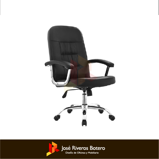 Mecanismo basculante con una posición de bloqueo a 90°, ruedas nylon 50mm, espaldar y asiento tapizados en cuerina sintética de poliuretano, base cromada 64 cm.
